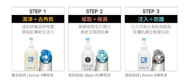 接著便在海菲秀的黑色握把上裝上專屬我的端頭,整個操作的過程中一共會使用到3種探頭,在第一次購買療程就會得到一組端頭,一般可以使用約4~5次再考慮購買新的端頭(耗材費用不貴!小資很可以負擔!)3個端頭使用順序依序是: