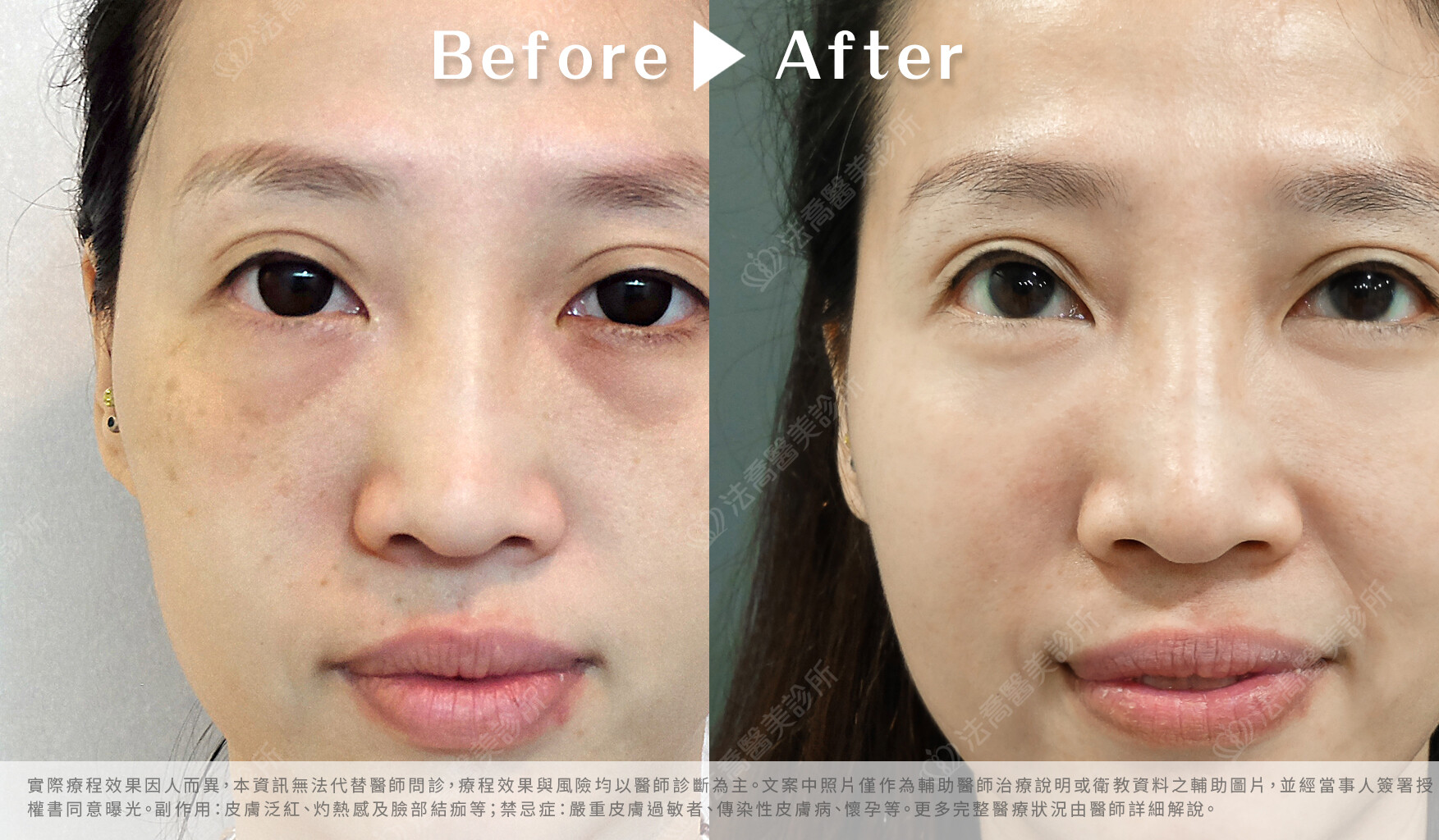副作用:術後可能會有短期瘀傷、腫脹或發紅現象,請避免曝露在大量陽光或高熱下。更多副作用會於與醫師溝通諮詢時,由醫師評估個人情況後告知。