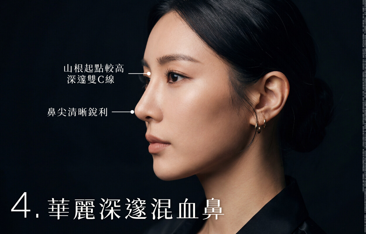 這是一款追求3D立體度的鼻型。山根的起點通常較高,並且強調眉骨與山根之間的「雙C線」深邃度。鼻樑高挺、鼻尖定義清晰且銳利,整個T字部位的骨相支撐力極強,猶如精雕細琢的藝術品。驚豔、華麗、充滿強大的混血氣場。這款鼻型在燈光與鏡頭下會產生極佳的光影效果,是標準的上鏡臉。