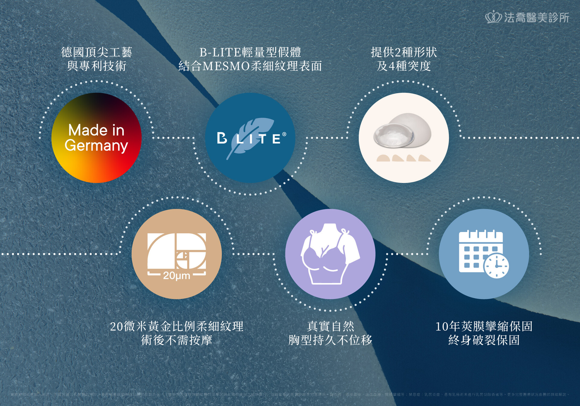 B-Lite® 比傳統植入物輕達 30%,卻提供相同的豐滿和緊實感覺,內容物為醫療級矽膠填充物增強了特殊微球,旨在減少重力影響,B-Lite® 乳房植入物減少了對乳房和結締組織的壓力,這樣可以保持自然、迷人的形狀,並確保更輕鬆的佩戴感。