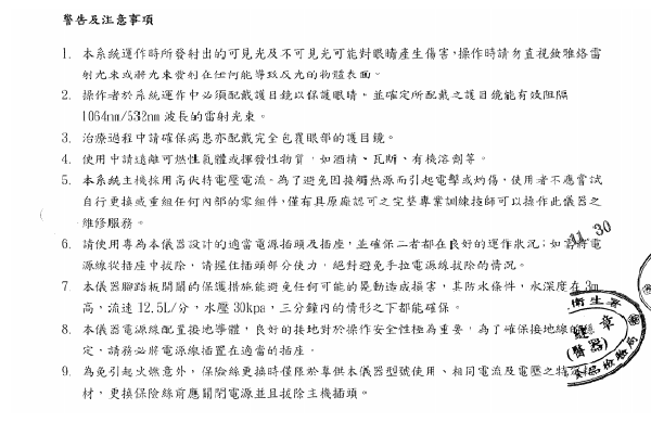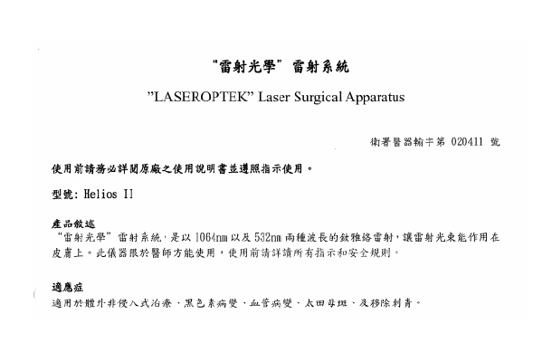 “雷射光學”雷射系統 衛署醫器輸字第020411號