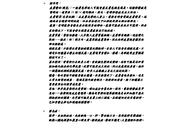 - 血管擴張、色素沉澱丶丘疹、結節丶痊瘡樣發疹、感染、蕁麻疹、過敏、多次治療後敏感性膚質、血管栓塞等。