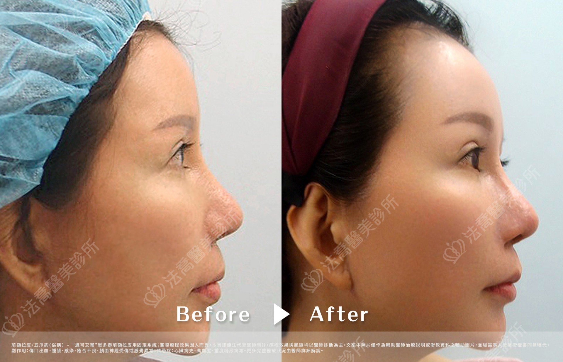 - 手術切口會在前額髮際線後,耳前和耳後,或是請病人於術前與醫師討論附加的手術項目,如上下眼皮手術,抽脂肪及脂肪注射等。