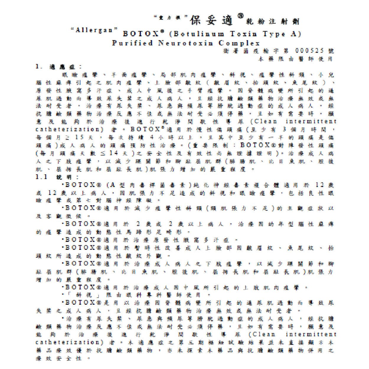 - BOTOX ® 適用於慢性偏頭痛(至少有3個月時間,每個月 ≥ 15 天,每次持續 4 小時以上,且其中至少有一半的頭痛是偏頭痛)成人病人的頭痛預防性治療。 (重要限制:BOTOX® 對陣發性頭痛 ( 每月頭痛天數≦14天) 之安全性及有效性尚無證據證明 )。