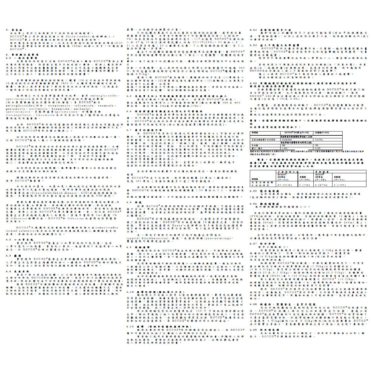 - 已有報告顯示肉毒桿菌素自注射部位擴散至遠端之不良事件發生,某些案例出現吞嚥困 難、肺炎或顯著衰弱而導效死亡(非常罕見)。