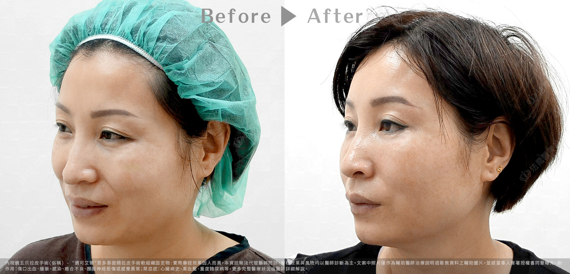 - 手術切口會在前額髮際線後,耳前和耳後,或是請病人於術前與醫師討論附加的手術項目,如上下眼皮手術,抽脂肪及脂肪注射等。