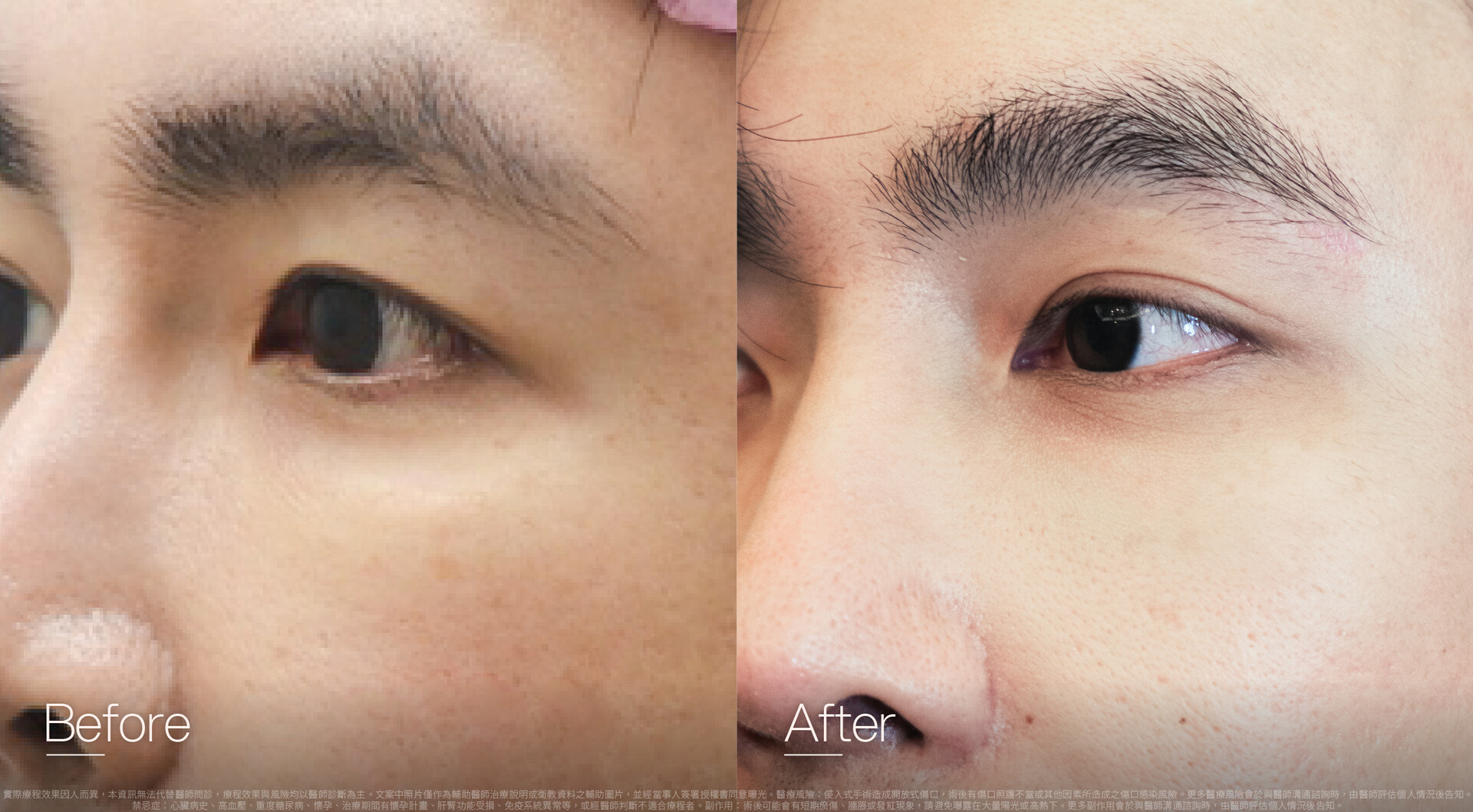 【眼部手術可能發生的副作用】:眼睛異物感或流淚、眼瞼外翻或雙眼不對稱之一時性現象、傷口感染、疤痕增生色素沉澱等情況。