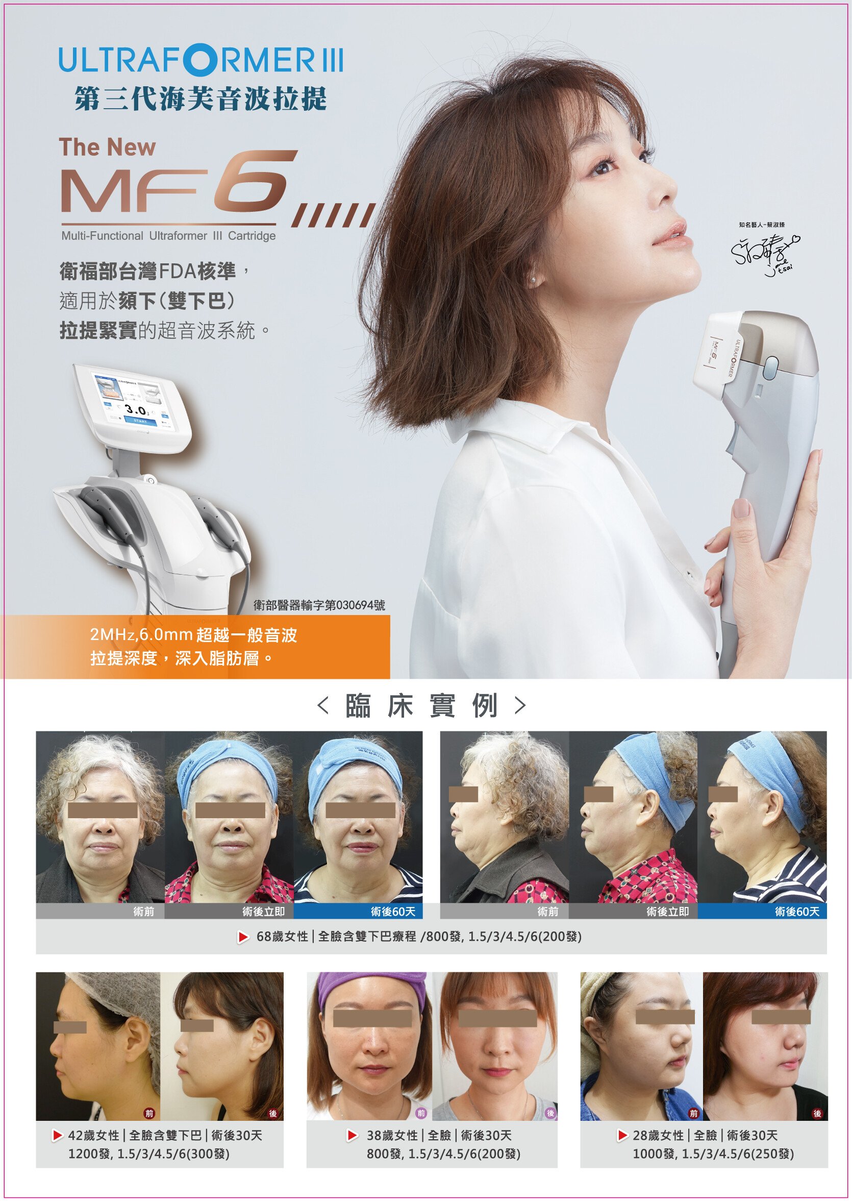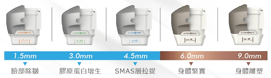 另外MMFU鉑金探頭設計的6.0mm及9.0mm的雙探頭深度則可以針對鬆弛的頦下、腹部及大腿,改善肌膚緊實度。