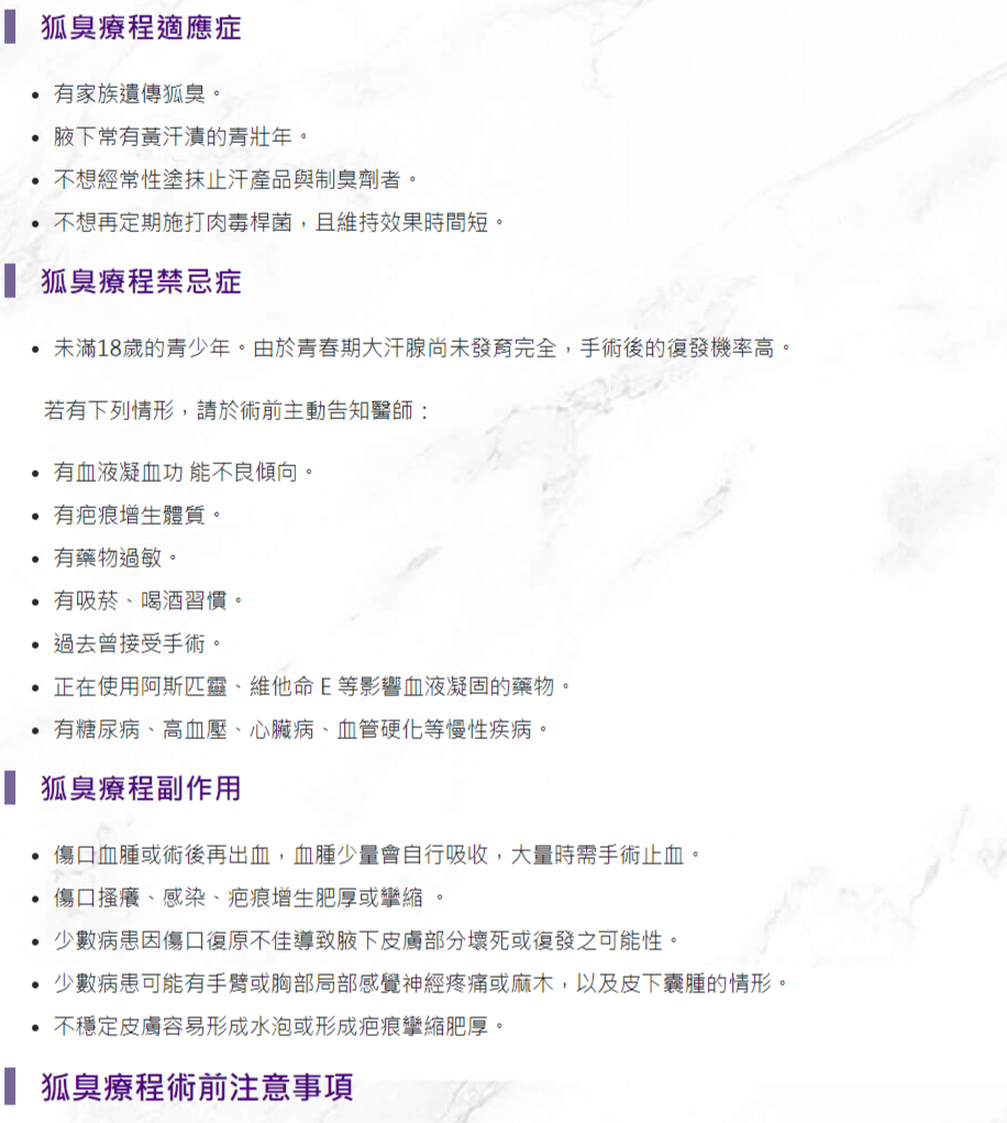 體味較輕者,可以日常的清潔、刮除腋毛,或是使用止汗劑、減少食用辛辣等氣味重的食物等方法,稍微獲得改善,但若是想改善狐臭,目前還是以手術治療為主。