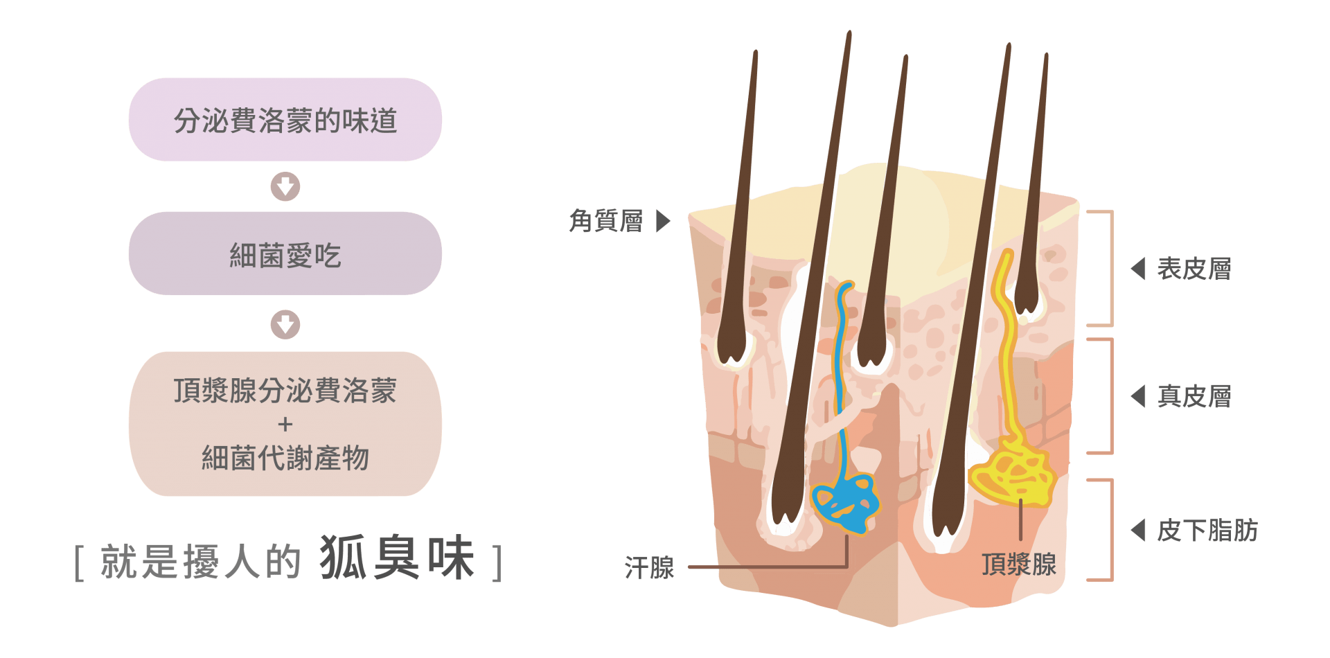 所謂的狐臭,是在青春期荷爾蒙刺激,腋下的大汗腺「頂漿腺」發達的情況下,分泌白黃色無味液體與微生物作用後,產生濃烈的臭味。臨床研究指出,大部分的患者都分布在18-44歲。