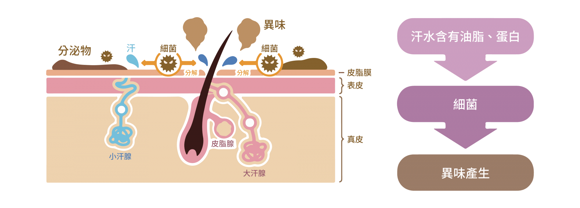 不少人以為腋下臭味是因為汗水,其實腋下分泌的汗水不會發臭,但因細菌會分解這些化合物,而那些分解的產物就會引發臭味。