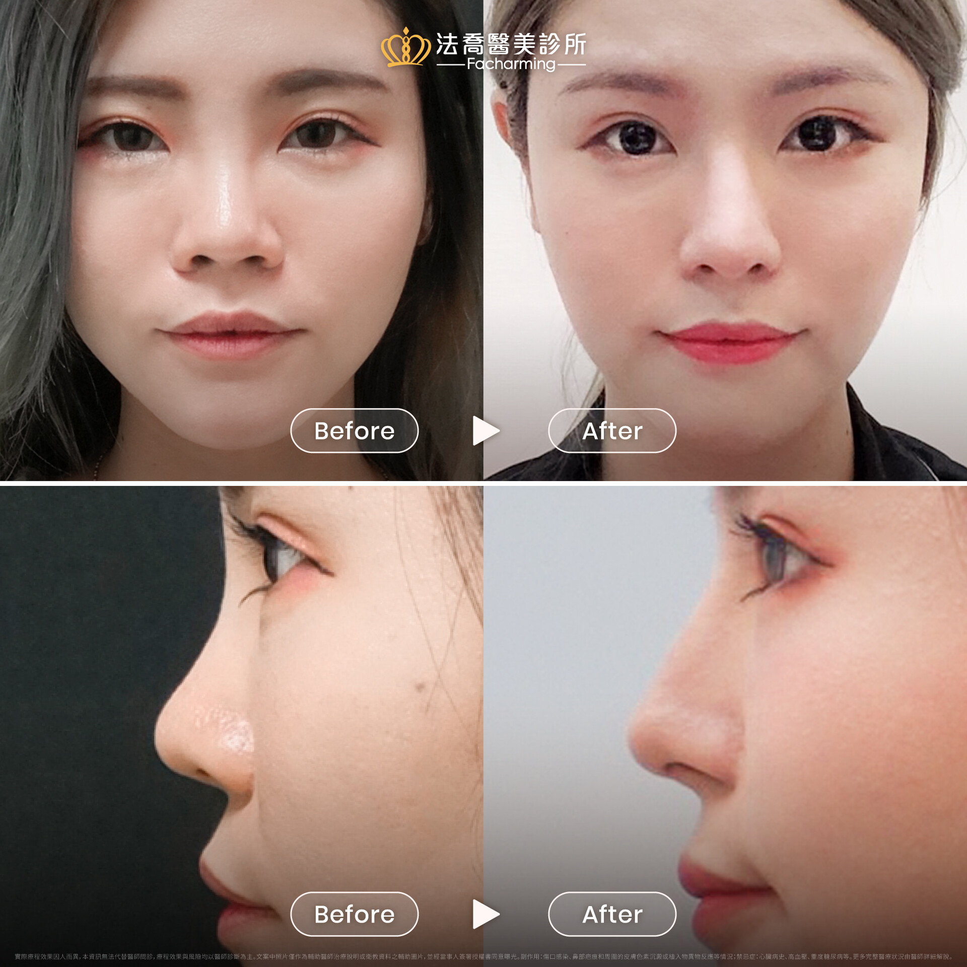 實際療程效果因人而異,本資訊無法代替醫師問診,療程效果與風險均以醫師診斷為主。文案中照片僅作為輔助醫師治療說明或衛教資料之輔助圖片,並經當事人簽署授權書同意曝光。副作用:傷口感染、鼻部疤痕和周圍的皮膚色素沉澱或植入物異物反應等情況;禁忌症:心臟病史、高血壓、重度糖尿病等。更多完整醫療狀況由醫師詳細解說。