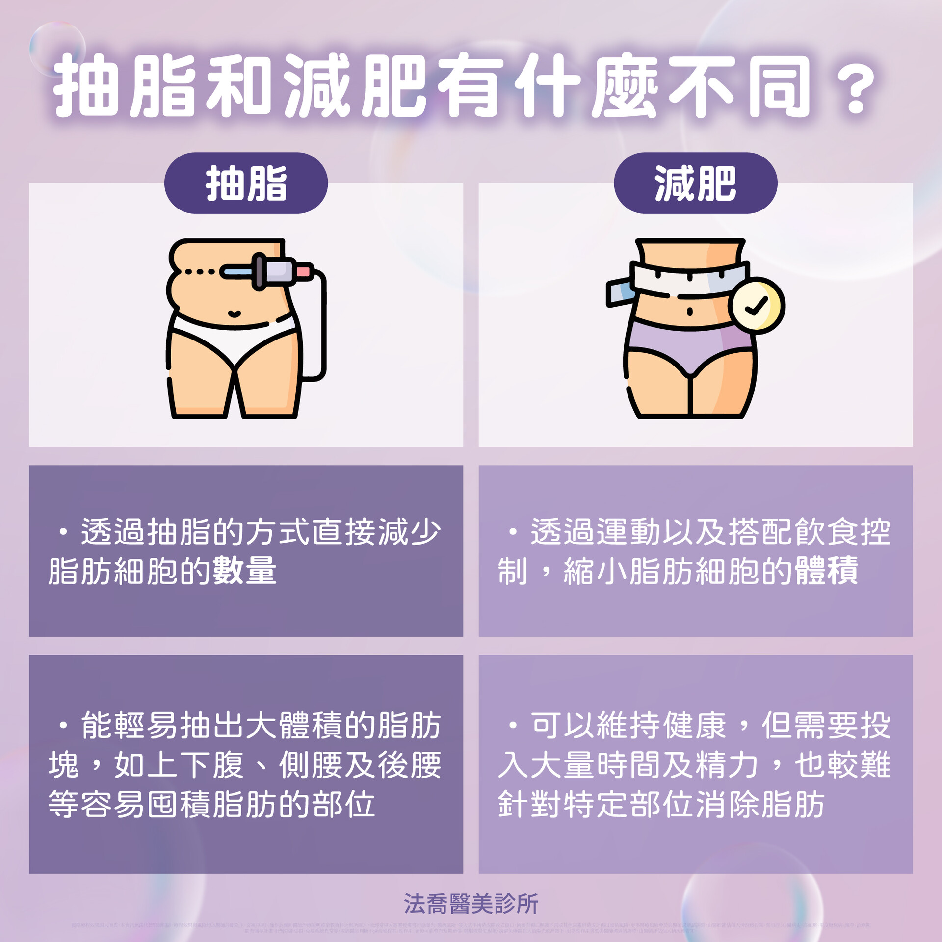 抽脂和減肥雖然都能幫助身體變得更纖盈,但這兩者的目的、原理和效果大不相同:
