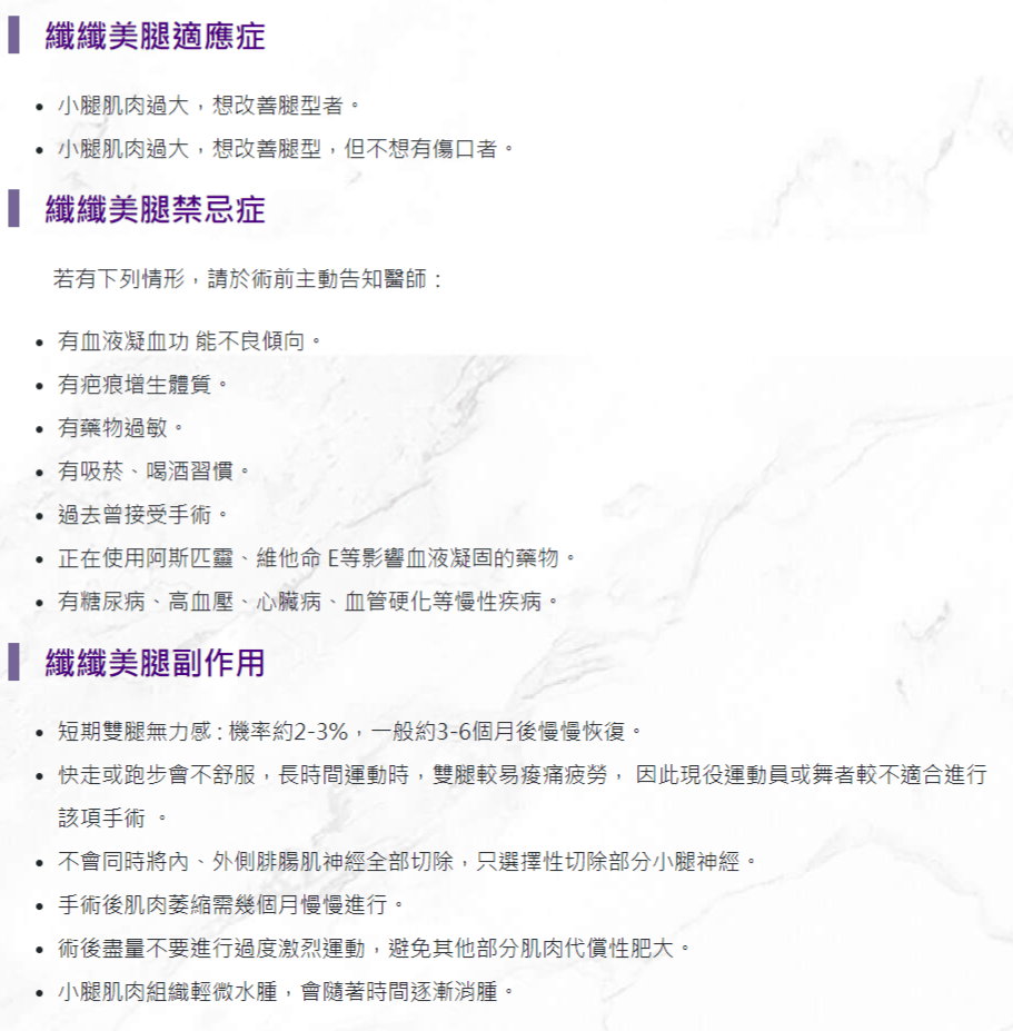 缺點 | 藥效維持4-6個月要反覆施打 | 對肌肉型蘿蔔腿沒效 | 傷口有疤痕 | 需要特殊儀器,有部分人效果不明顯 |